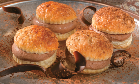 Beat the cream, cocoa powder and remaining sugar in a medium bowl with an electric mixer set on high speed until stiff peaks form. Split the pastries into 2 layers. Spread about 2 teaspoons chocolate mixture on 30 bottom layers. Top with the top layers. Sprinkle additional cocoa powder over the pastries, if desired.