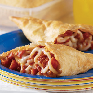 Unfold the pastry sheets on a lightly floured surface. Roll each sheet into a 12-inch square and cut each into 4 (6-inch) squares. Place about 1/2 cup pepperoni mixture in the center of each square. Brush the edges of the squares with the egg mixture. Fold the squares in half over the filling to form triangles. Crimp the edges with a fork to seal. Place on 2 baking sheets. Brush the pastries with the egg mixture.